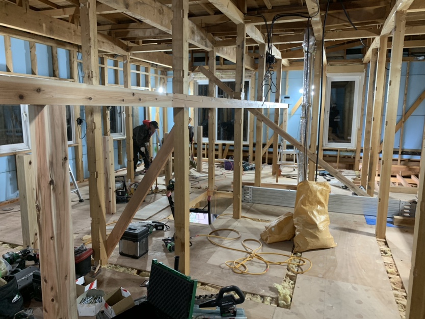 2F外壁・天井は残したまま、内部で小屋組みを製作し野地板まで施工します。